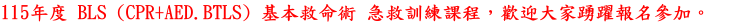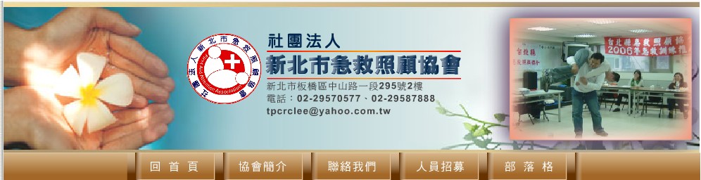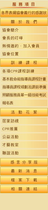 1.基本救命術(BLS).2.基本創傷救命術(BTLS)3.心肺復甦術(CPR)4.心肺復甦術暨自動體外電擊器(CPR+AED)本協會以推廣、研討急救與照顧技能和服務,促進急救與照顧技能指導員培訓及繼續教育,提升民眾對急救與照顧正確的認知為宗旨。深受各界好評及表揚,熱情邀約,各界人士,一同參與 02-2957-0577。